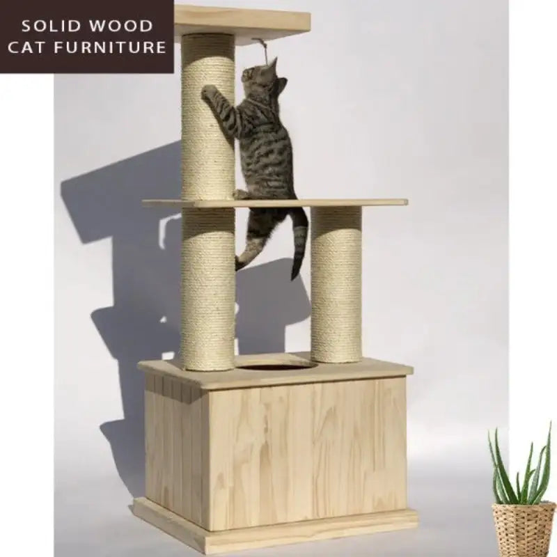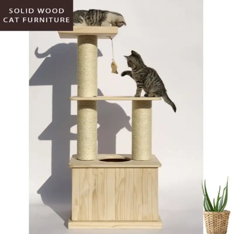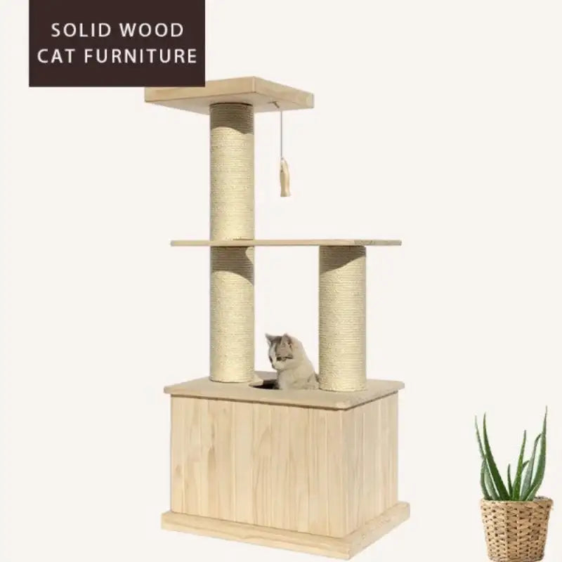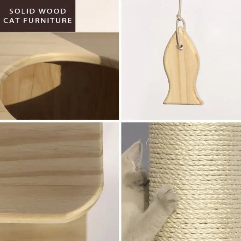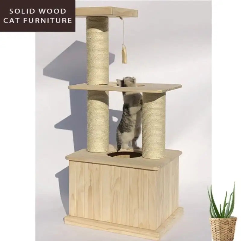 This solid wood cat tree condo use natural solid wood, high-quality material, safe and non-irritating.